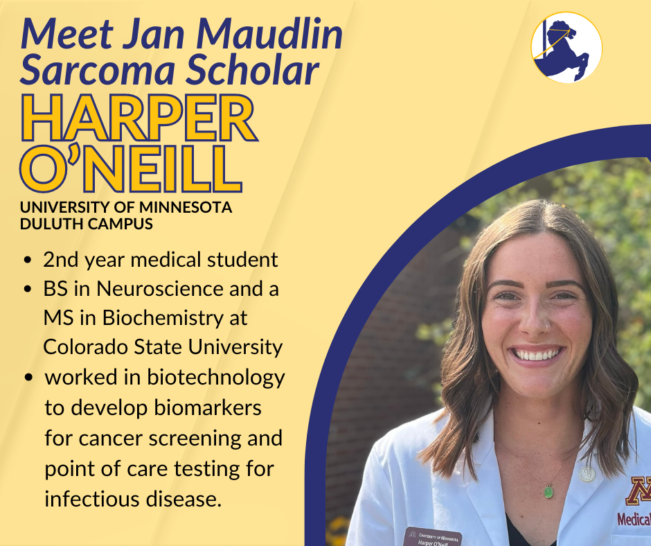 Harper is a second year medical student at the University of Minnesota School Duluth campus. She earned a BS in Neuroscience and a MS in Biochemistry at Colorado State University.  Prior to medical school, she worked in biotechnology to develop biomarkers for cancer screening and point of care testing for infectious disease. She is interested in oncology as a specialty, and is passionate about the intersection of medicine, research, and education. As a sarcoma scholar, she is excited to teach others about sarcomas, contribute to research, and connect with patients and their communities.